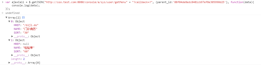 var ajaxCall = $.getJSON("http://sso.test.com:8080/console/a/sys/user/getMenu" + "?callback=?", {parent_id:'88f04de8edc0481cb97ef8e305990d25'}, function(data){