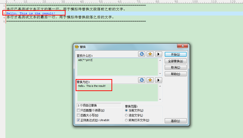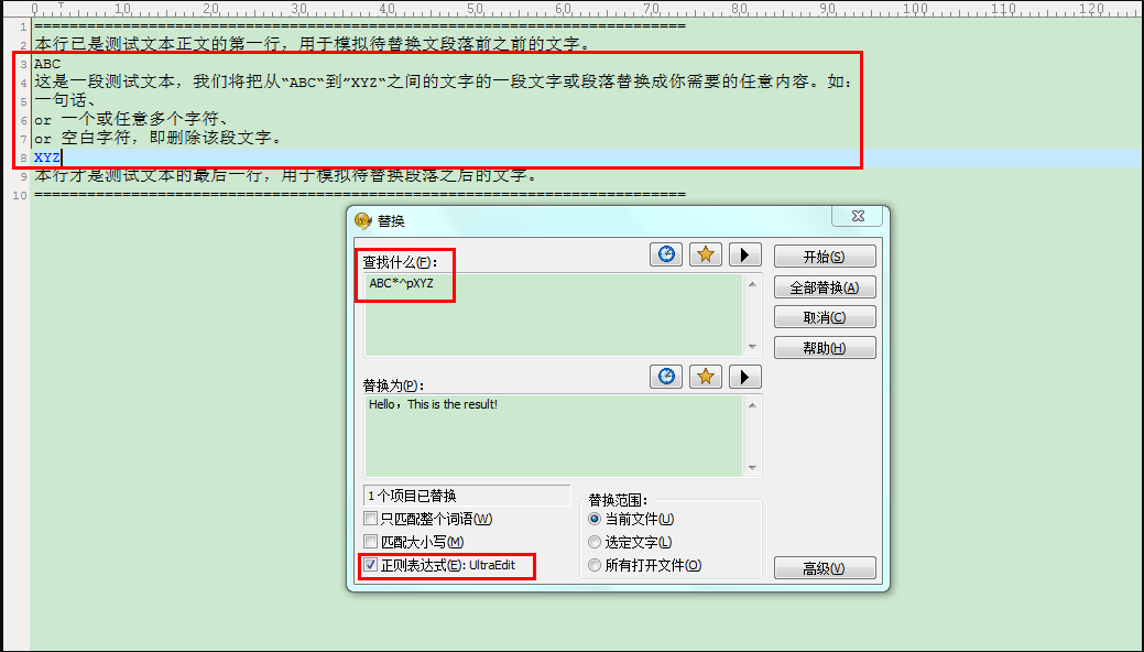 操作方法:打开 “ 替换”窗口,在“查找什么”处录入如下的正则表达式:“ABC*^pXYZ”(注意不包括引号,即只需录入引号之间的内容即可),在“替换为”处录入如下的内容:“Hello,This is the result!”